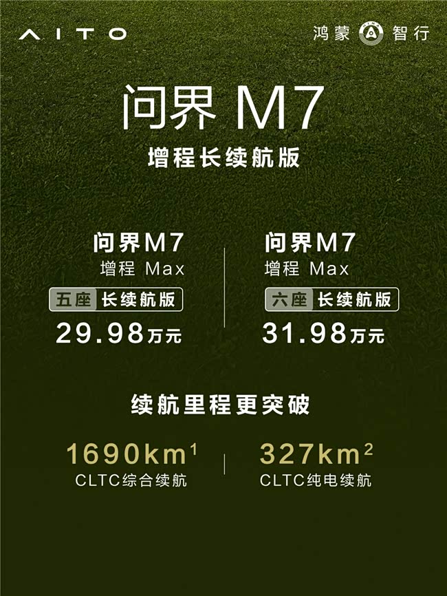 当天,全新问界M7增程长续航版也宣告上市:增程Max五座长续航版定价29.98万元,增程Max六座长续航版定价31.98万元,即日起下定可享至高6万元购车权益。
