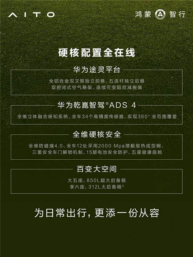 值得一提的是,全新问界M7增程长续航版将在售车型的核心配置尽数保留,硬核实力丝毫不减:依托华为途灵平台,新车配备全铝合金双叉臂前悬、五连杆后悬,再加上双腔闭式空气悬架与连续可变阻尼减振器,既能让驾乘更舒适,又能兼顾操控的精准质感;华为乾崑智驾ADS 4辅助驾驶系统搭载34个感知硬件,可实现全场景、全天候的动静态目标识别,不仅能显著提升雨天、雾天等恶劣天气下的行车安全性,还能精准识别后向悬浮物与负向场景,实现360度无死角感知;全维防碰撞4.0功能更能全方位提升行车安全,为用户的每一段行程保驾护航。