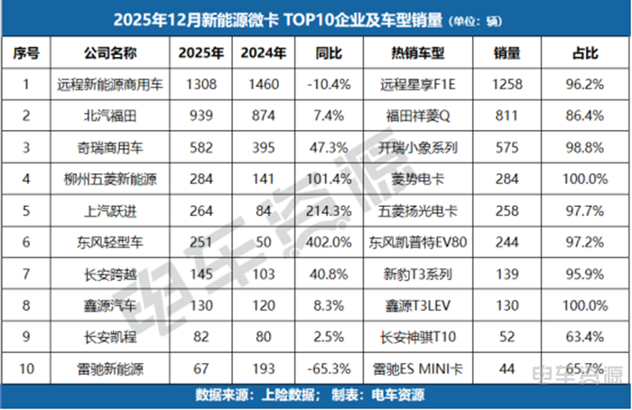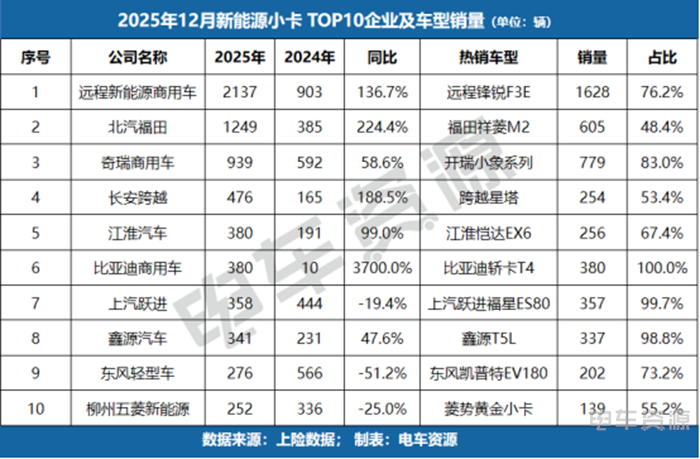 微卡市场中,远程新能源商用车12月销量,居首但同比下滑,而东风轻型车、柳州五菱等企业凭借单一爆款车型实现数倍增长。