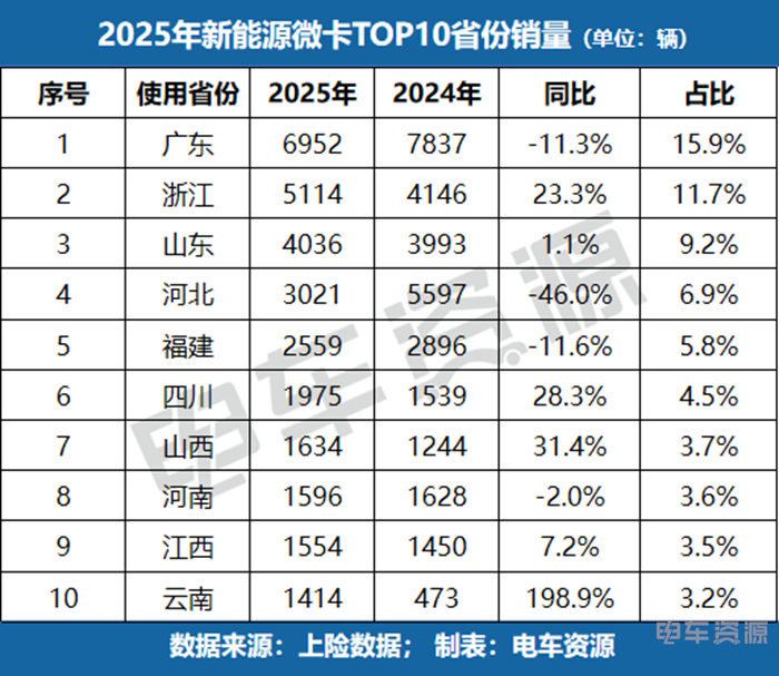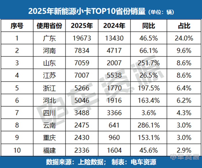从全年区域销量来看,广东是新能源微小卡的核心消费市场。小卡领域,广东以19673辆销量、24.0%占比遥遥领先,同比增长46.5%,相当于第二名河南(7834 辆)的2.5倍;微卡领域,广东以6952辆销量、15.9%占比位列第一,尽管同比下滑11.3%,但市场基础依然稳固。