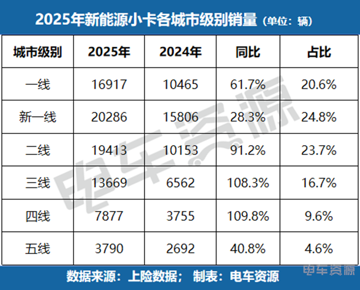 而在城市级别分布上,小卡市场呈现全面爆发态势:一线城市销量16917辆,同比增长 61.7%;三线、四线城市增速尤为突出,分别达108.3%和109.8%;五线城市也实现40.8%的同比增长,显示小卡车型在各级城市的适配性均得到认可。