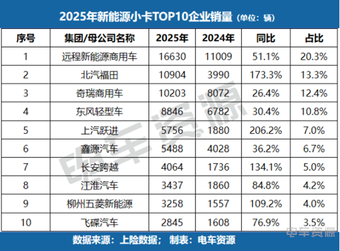 远程新能源商用车以16630辆销量,蝉联2025新能源小卡年度冠军,同比增长51.1%,市场份额20.3%。北汽福田小卡车型再次展现惊人增长,年销量10904辆,同比暴涨173.3%,市场份额达13.3%,稳居第二;奇瑞商用车销量10203辆,同比增长26.4%,市场份额12.4%。