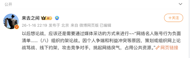微博CEO王高飞随后引用平台规则,将此举定性为对“组织约架论战”的处置。