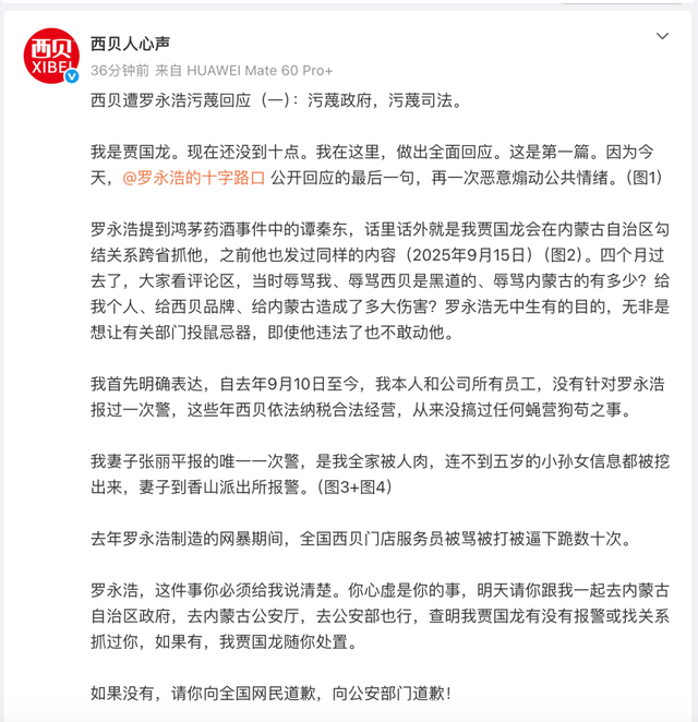 当晚不到10点,贾国龙通过认证为“内蒙古西贝餐饮集团有限公司”的微博账号“西贝人心声”发布了一条回应,然而,最终发布的回应内容较为简短,贾国龙仅表示自己和公司员工未针对罗永浩报过警,并强调西贝“依法纳税合法经营,从来没搞过任何蝇营狗苟之事”。他还提到,妻子报的唯一一次警是因为全家被人肉,连不到五岁的小孙女信息都被挖出来。