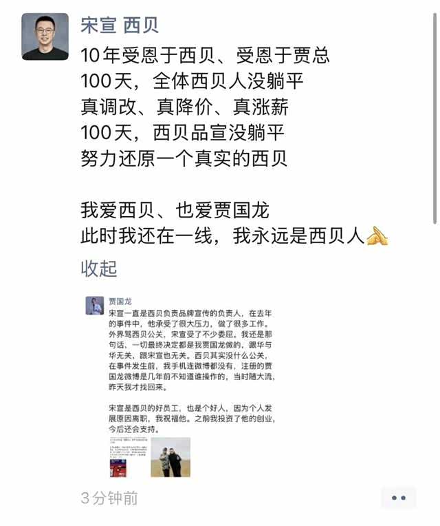 宋宣也在朋友圈发文告别,称:10年受恩于西贝,受恩于贾总;100天,全体西贝人没躺平;真调改,真降价,真涨薪;100天,西贝品宣没躺平;努力还原一个真实的西贝。我爱西贝、也爱贾国龙;此时我还在一线,我永远是西贝人。