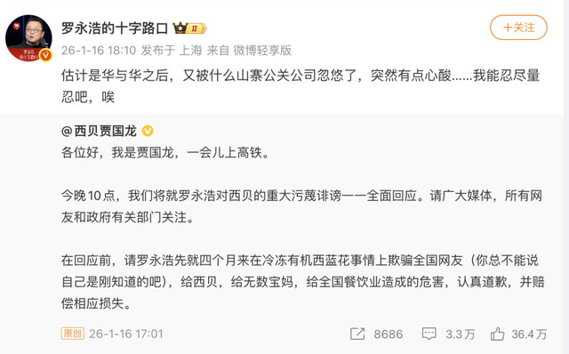 但服软刚一个月,1月16日,贾国龙又在微博上表示:“今晚10点,我们将就罗永浩对西贝的重大污蔑诽谤一一全面回应。”
