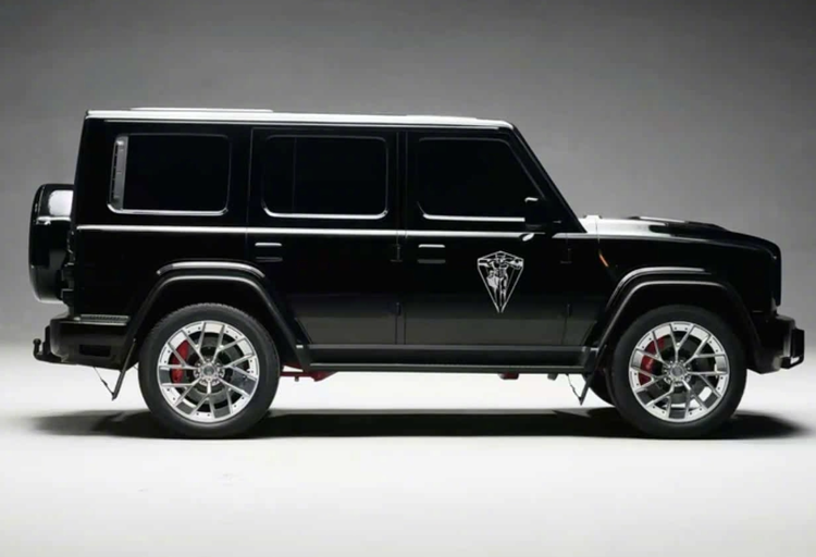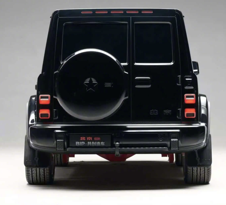 从侧面我们也能看到方正的轮眉,以及硬派的外观造型,非常经典。除此之外,我们还发现这款共创版车型有着独特的车身logo以及全新锻造轮毂设计。仔细看轮毂,采用了鹿角样式的设计,同样象征了性能。至于尾部,采用的是备胎后挂设计,并且还是对开门造型,这一点与奔驰大G还是有一些区别的,但是总体而言轮廓非常类似,比如粗壮的保险杠,方正的尾灯设计,并且还有着较高的底盘离地间隙以及拖钩设计。