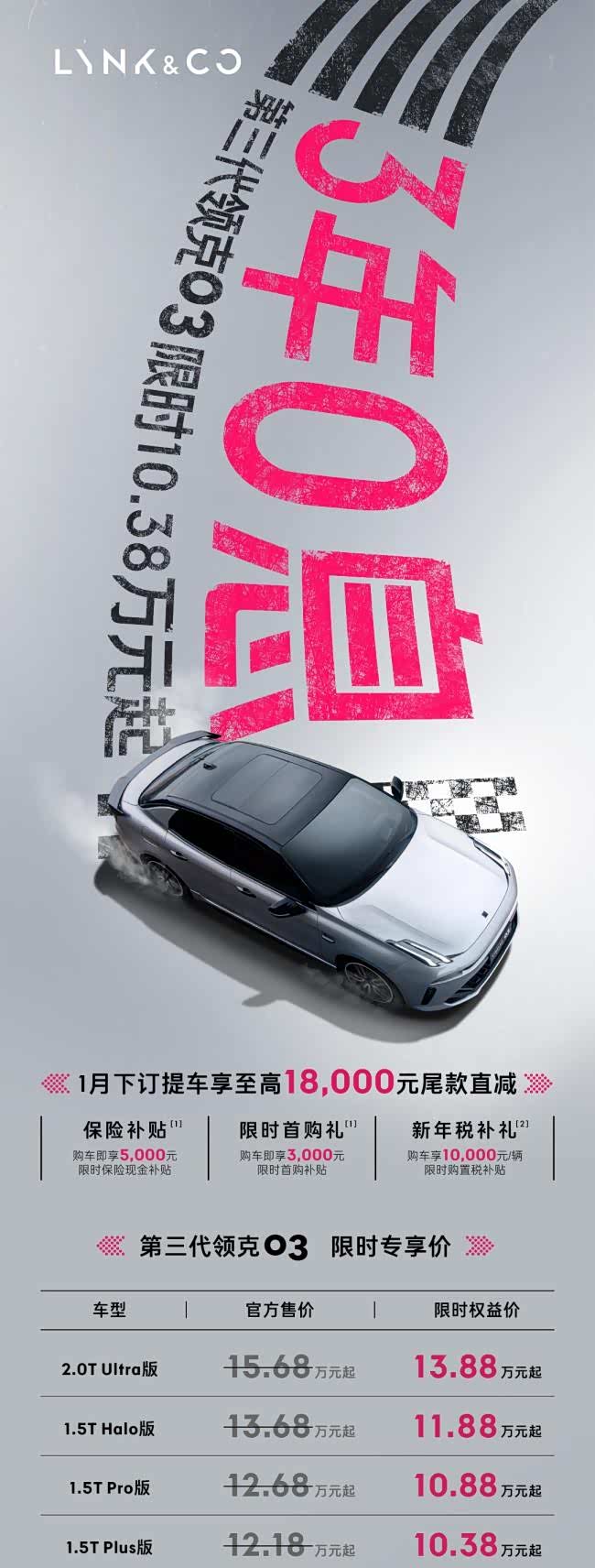 当前正值1月购车佳期,领克03家族同步推出诚意购车福利,下订提车可享至高18000元尾款直减等优惠。其中,第三代领克03限时专享价10.38万起,可选“6万2年0息”或“5年贷3年0息”方案,支持0首付申请,年轻用户入手轻松无压力;新领克03+性能进阶版车型专享“2年15万0息”,让性能车触手可及。