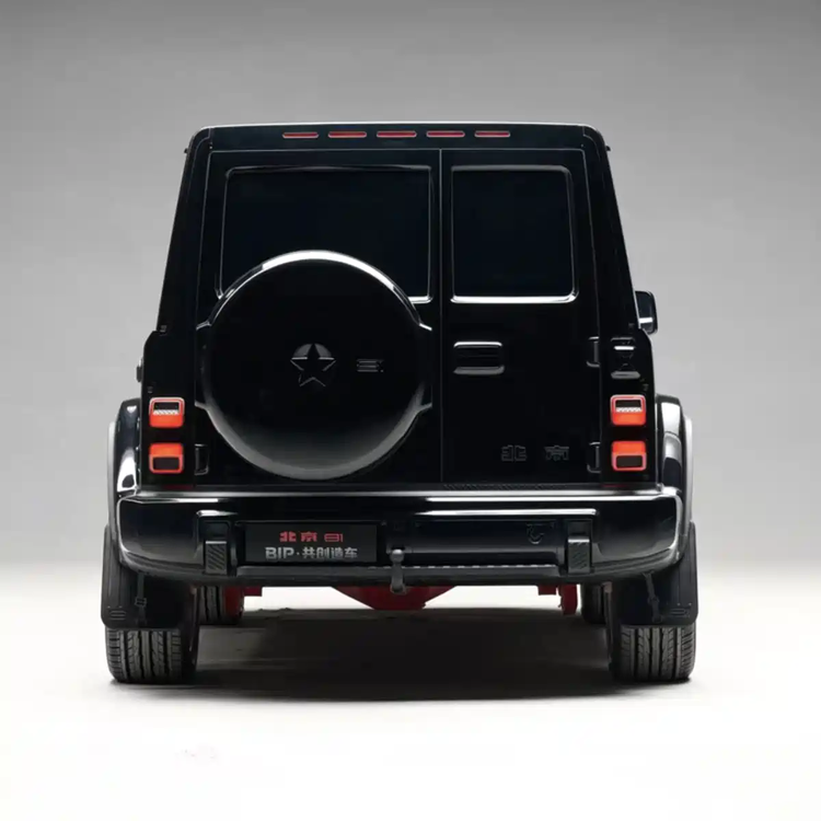 北京81 2.0共创版在1.0版本基础上进行了多项设计优化。前机舱盖的凸起弧度有所降低,保持了硬朗感的同时让线条更流畅。五孔式前格栅进行了精细化改造,每个孔内镶嵌红色LED灯组。大灯采用“天圆地方”设计理念,方形外壳包裹圆形灯组。大灯内部设有五条间断曲线LED灯带和五条转向灯带。车身侧面线条棱角分明,腰线贯穿车身,搭配外扩轮眉和新设计的双七条辐轮圈。