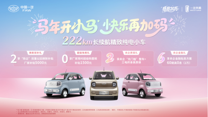 摩登马不仅在车型定位上别具一格,其推出的购车优惠政策更是诚意满满。为迎接马年并庆祝20万辆下线里程碑,一汽奔腾小马同步启动“马年开小马 快乐再加码”新年购车活动。