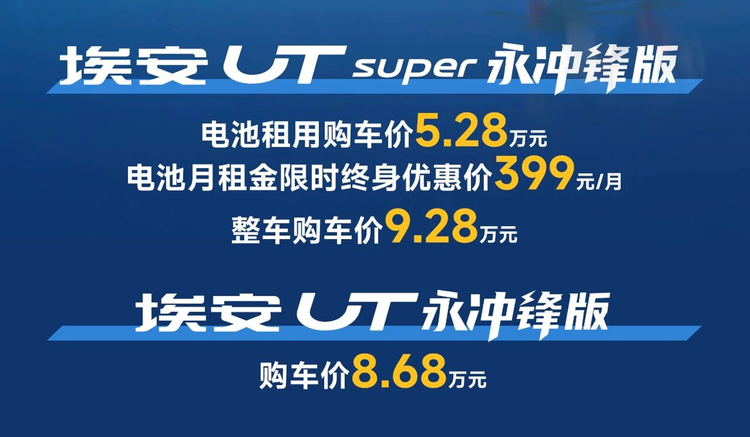 车家号·0浏览·2026-01-17 23:25 · 广东日前,埃安 UT 系列永冲锋版正式上市。埃安 UT 永冲锋版购车价 8.68 万元,UT super 永冲锋版整车购买价 9.28 万元,电池租用购车价 5.28 万元,电池月租金限时终身优惠价 399 元/月。