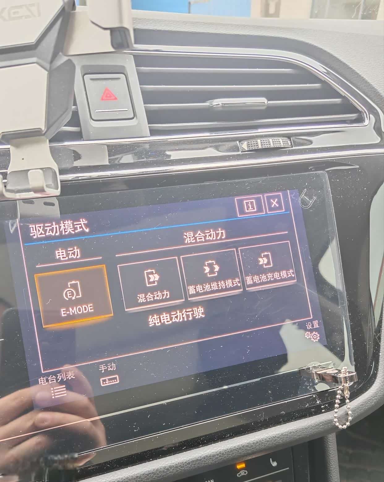 然而,当车速达到30km时,发动机突然自动启动,显示屏上显示“发动机需长时间启动”(如图一)。于是,我缓慢靠边停车。重启后,确认变速杆旁边的E-MODE指示灯已亮起(图二),中控屏也选择了纯电动模式(图三)。