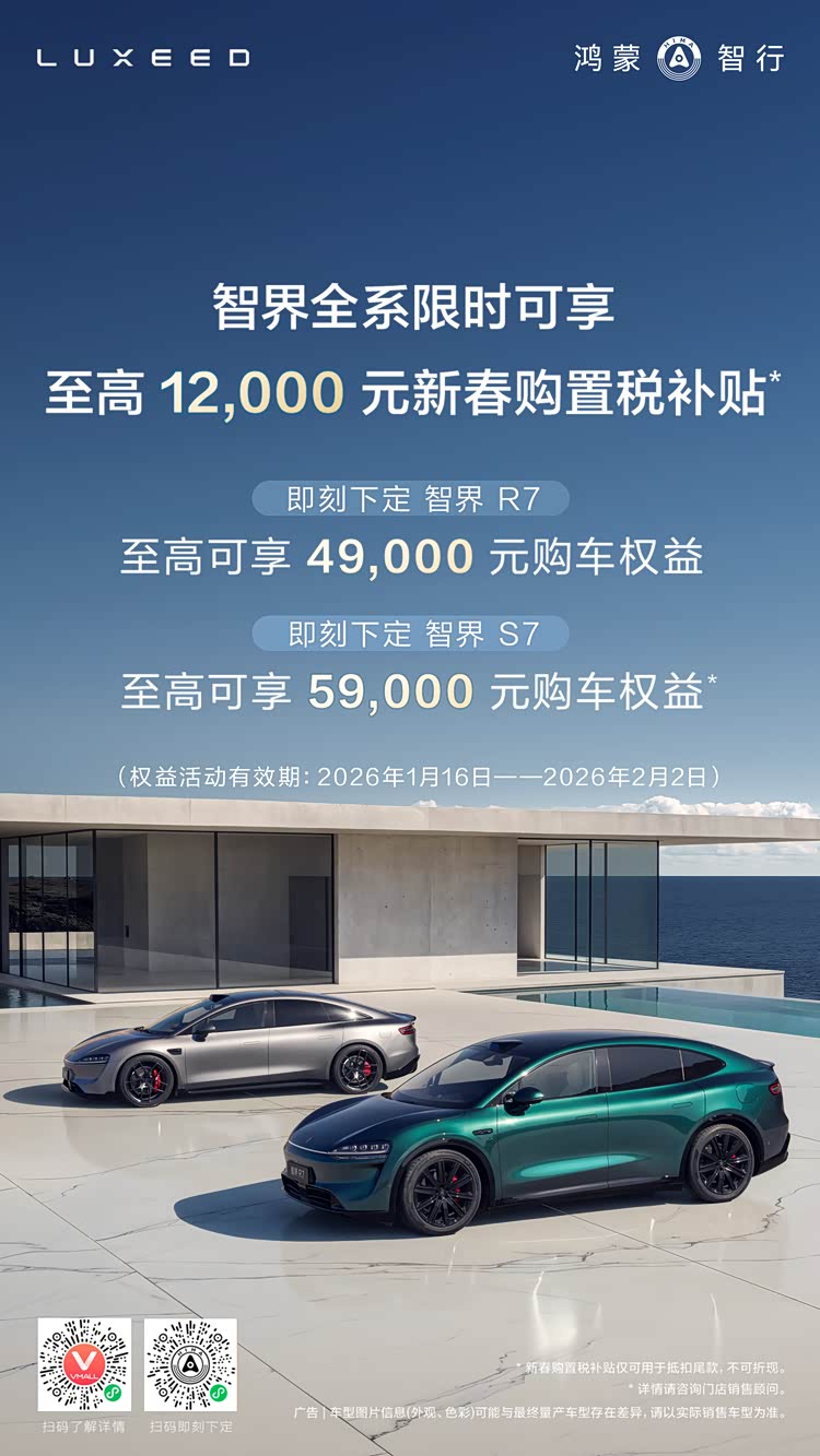 心动不如行动!优惠时间有限,如果正在寻找适合春节出行的新能源车型,不妨亲自到店试驾智界旗下车型。无论是超长续航的智界R7,还是充电效率惊人的智界S7,它们都将是返乡归途和生活进阶的不二选择。年前买车,就等智界!