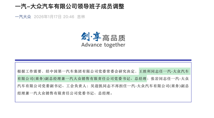 2026年1月17日,一汽-大众迎来重要人事布局,王胜利任一汽-大众汽车有限公司(商务)副总经理兼一汽大众销售有限责任公司党委书记、总经理。与一汽-大众党委书记兼总经理董修惠,再度组成核心搭档。