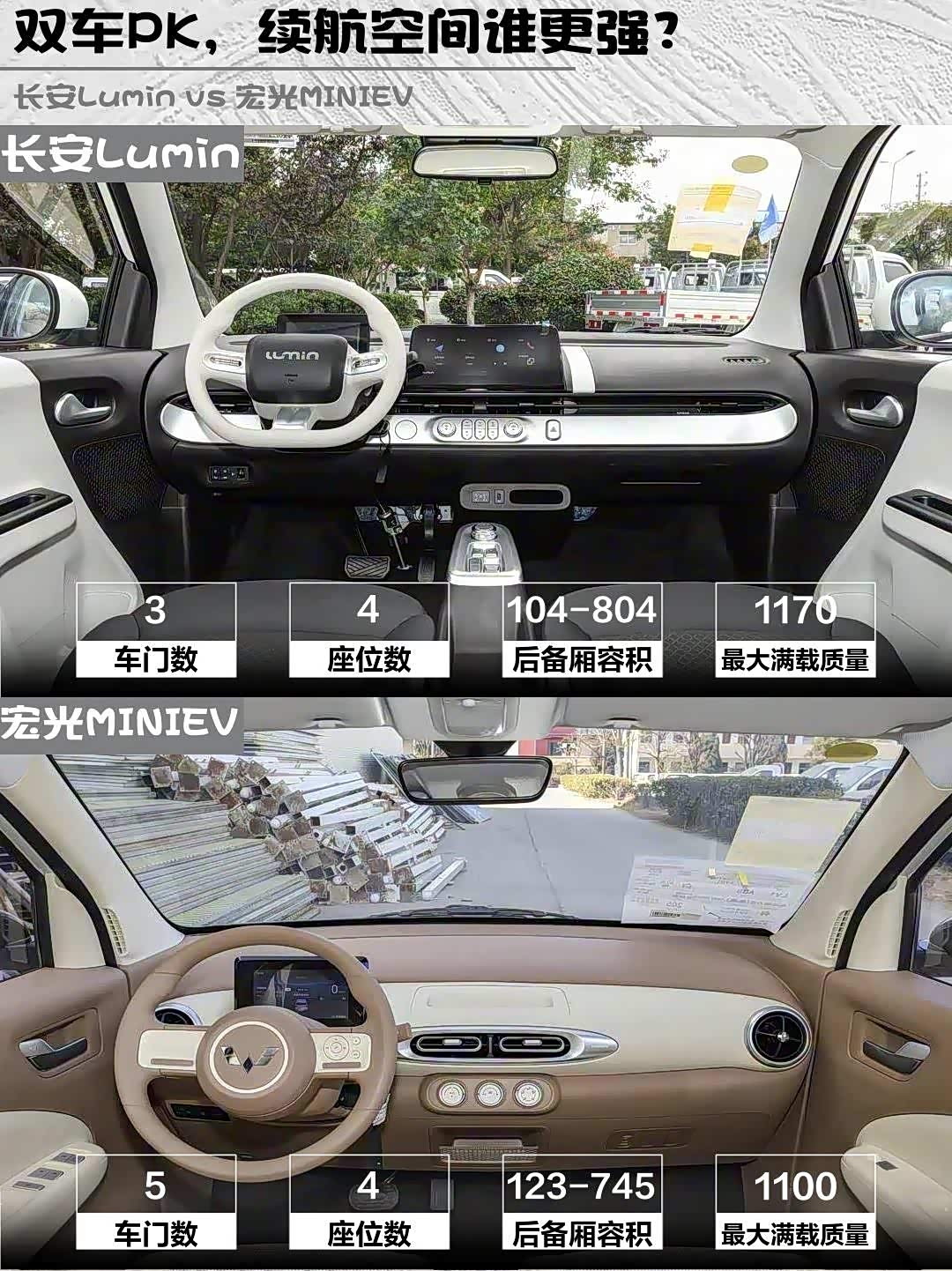 虽然都是四座,Lumin车宽多出19cm!实测1米8身高坐前排,Lumin头部剩一拳,MINIEV会扫头发。后备箱MINIEV常规容积多19L,但Lumin后排全放倒能塞下自行车🚲。MINIEV四门设计进出方便,Lumin两门造型更酷但上下后排要翻座椅。