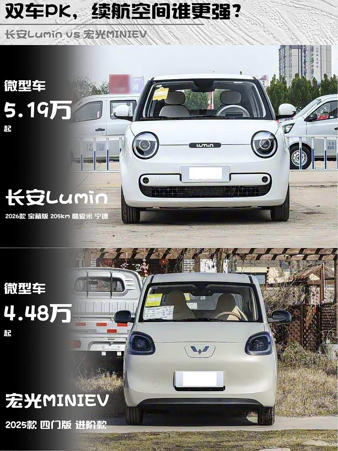 最近在纠结长安Lumin 2026款宝藏版和 宏光MINIEV(参数|询价) 2025款四门进阶款?作为两款5万级纯电代步神车,实测对比干货来了!🔥