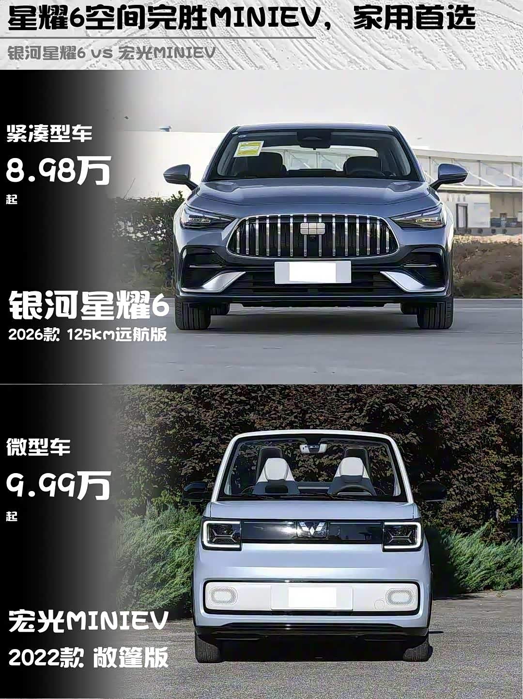 最近在纠结银河星耀6 2026款125km远航版和 宏光MINIEV(参数|询价) 2022款敞篷版的朋友看过来!这两台车简直是两个世界的产物,但价格居然都在10万左右,今天就从真实用车角度给你们掰开揉碎讲明白👇