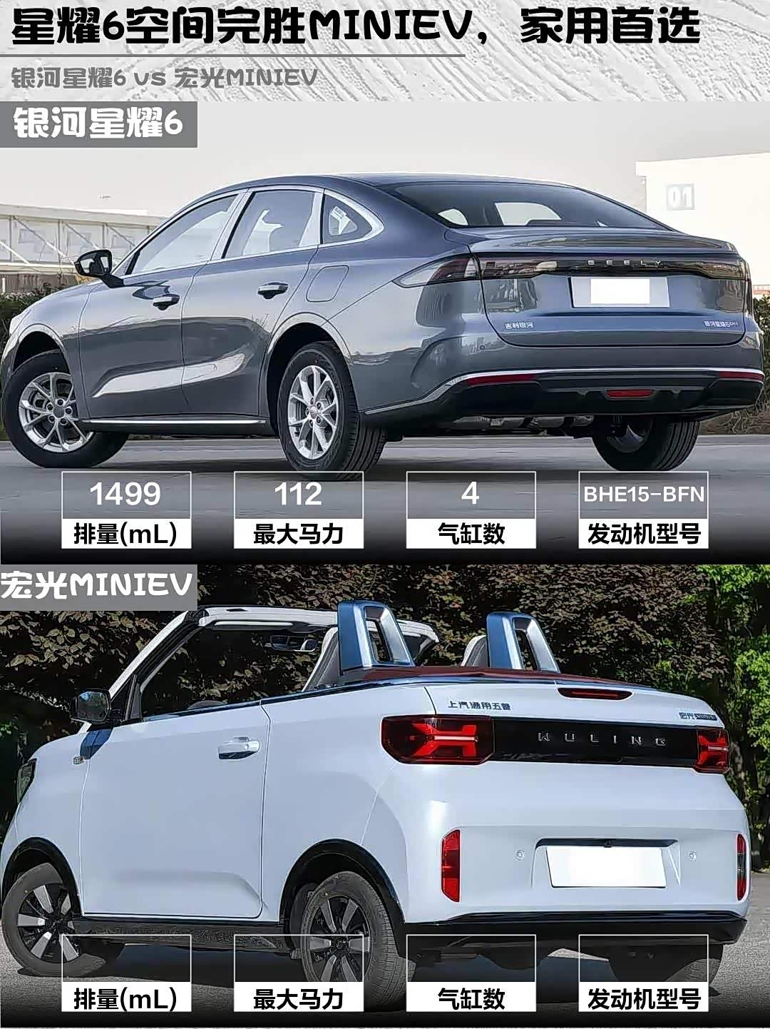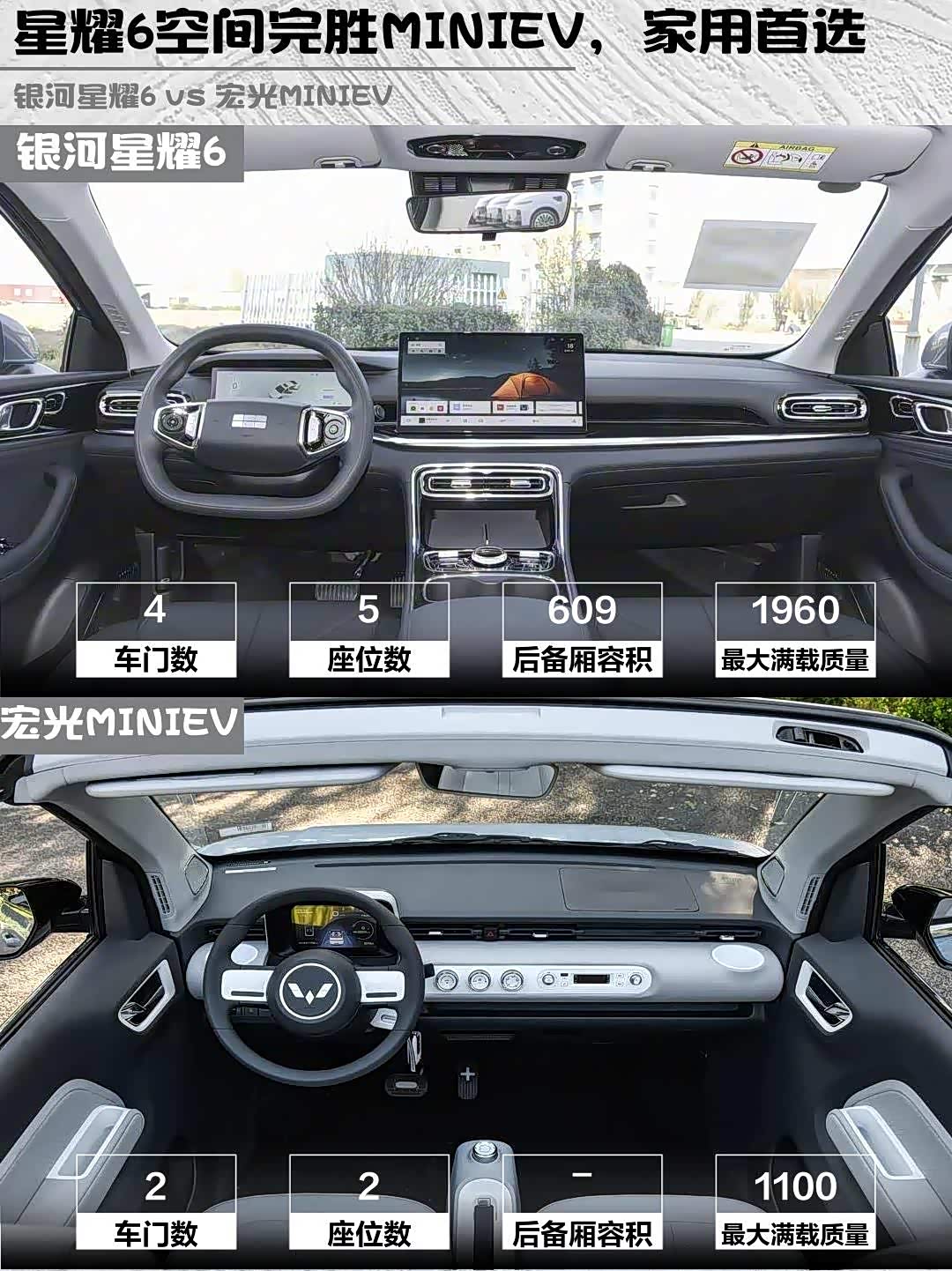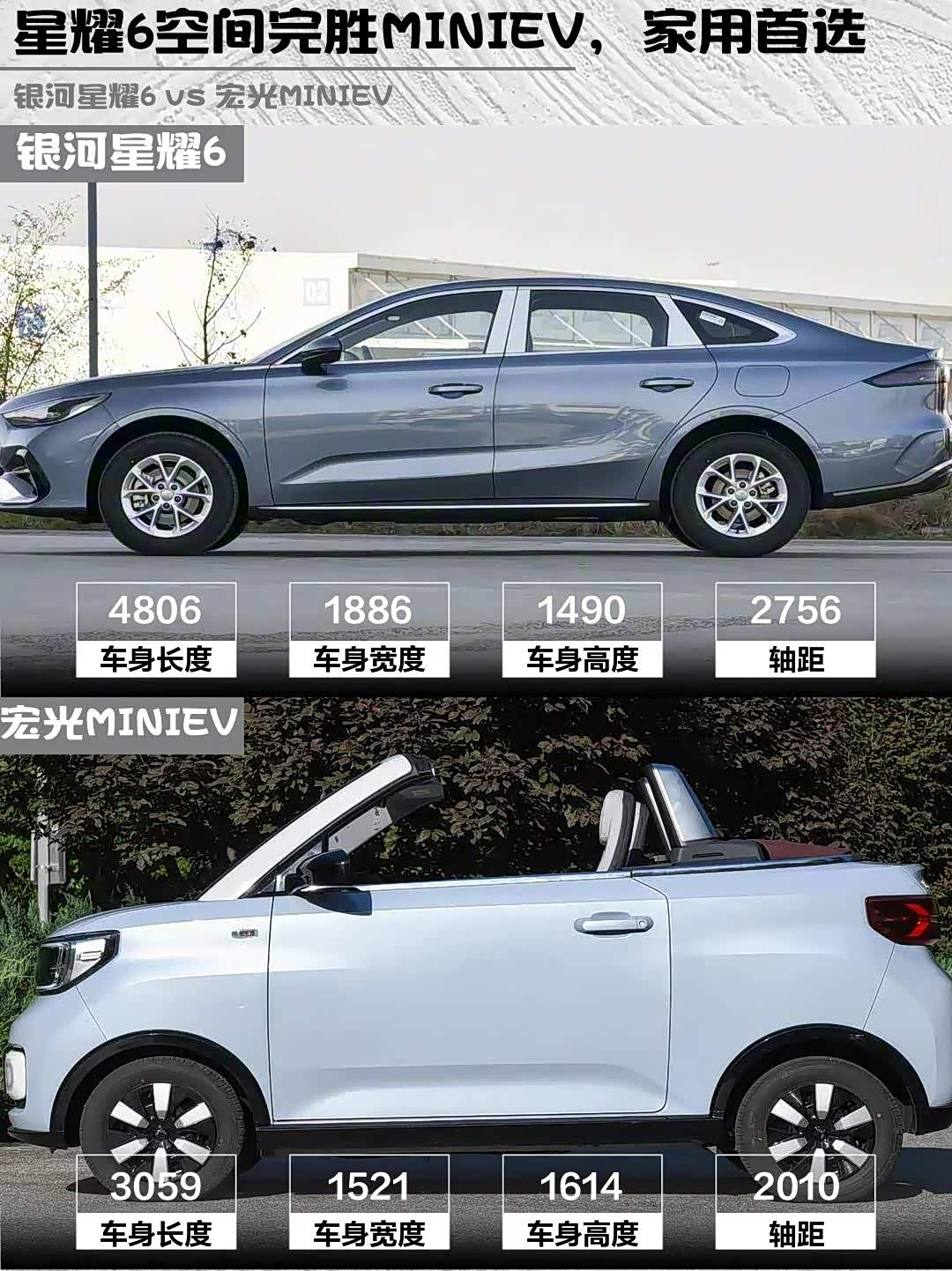 银河星耀6妥妥的「空间魔术师」!4.8米车长+609L后备箱,后排能跷二郎腿,装过两箱化肥的老哥直呼真香。而宏光MINIEV敞篷版只有3米车长,坐两人刚好,后备箱?不存在的~适合单身贵族或接娃专用。
