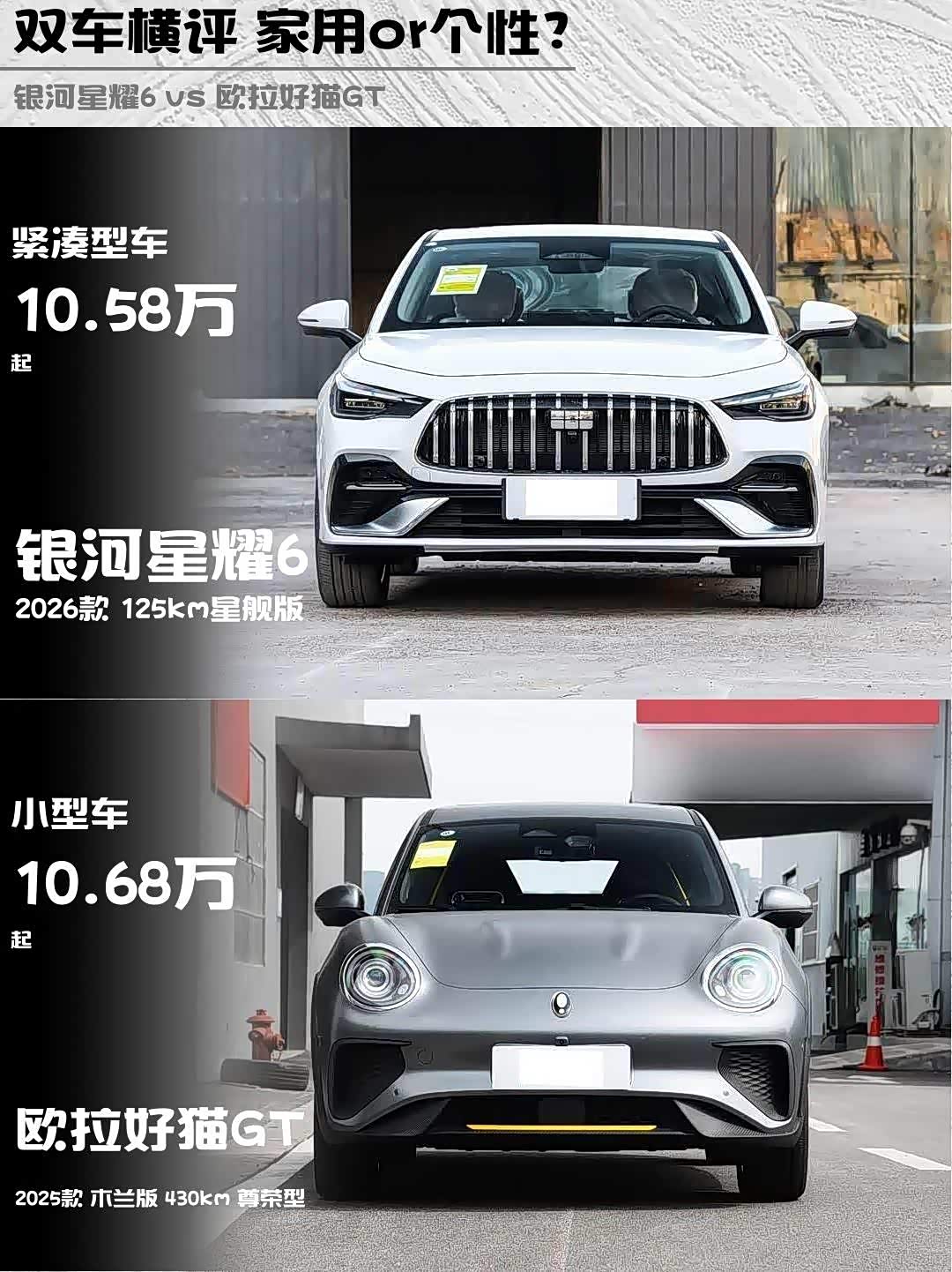 最近在选新能源车的小伙伴看过来!今天给大家深度对比两款10万级热门选手——银河星耀6 2026款125km星舰版 vs 欧拉好猫GT(参数|询价) 2025款木兰版430km尊荣型,实测干货直接上菜!🔥