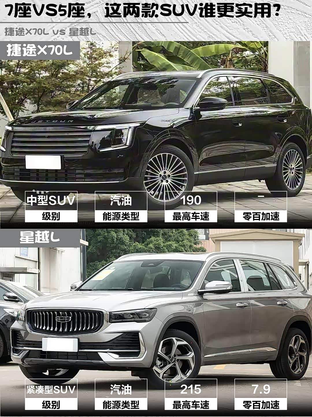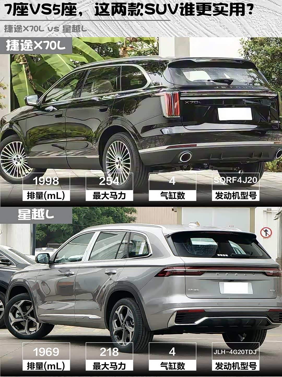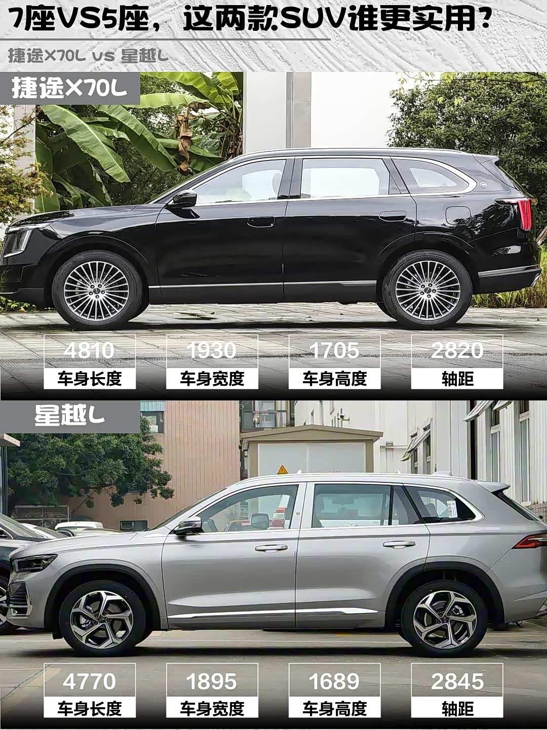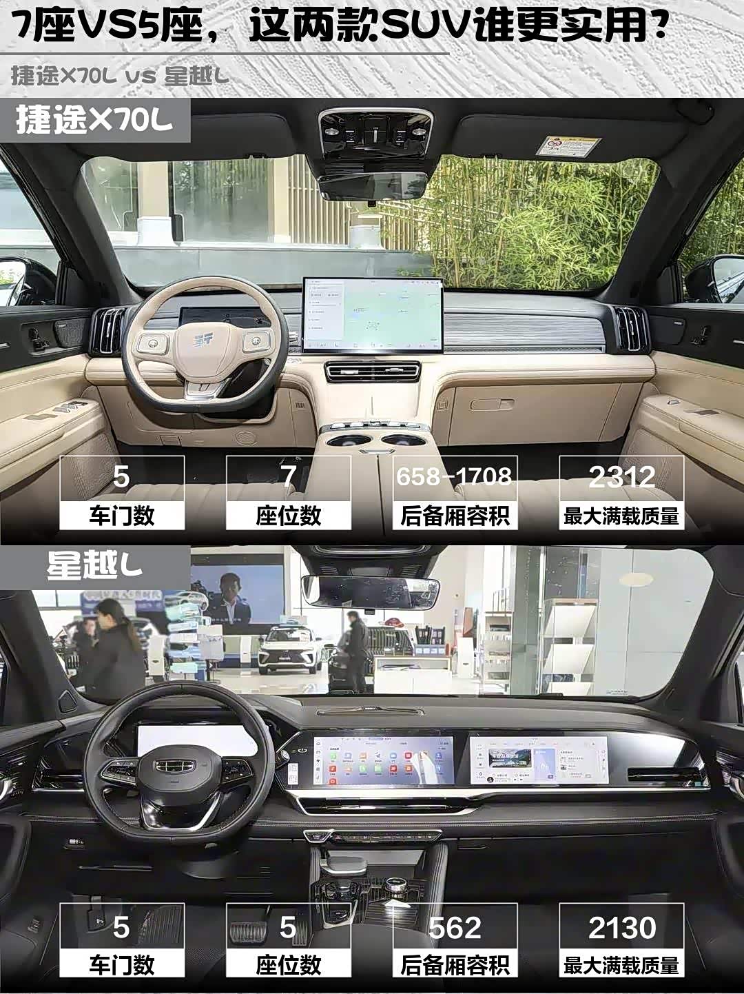 捷途X70L的7座布局太能打了!4810mm车长+2820mm轴距,第三排坐176cm以下成人无压力,放倒后1708L后备箱能当小货车用🧳。星越L虽然是5座,但2845mm轴距让后排轻松翘二郎腿,562L后备箱日常够用但扩展性稍逊。家里有二胎或经常载人的闭眼选捷途,小两口用星越L更精致。