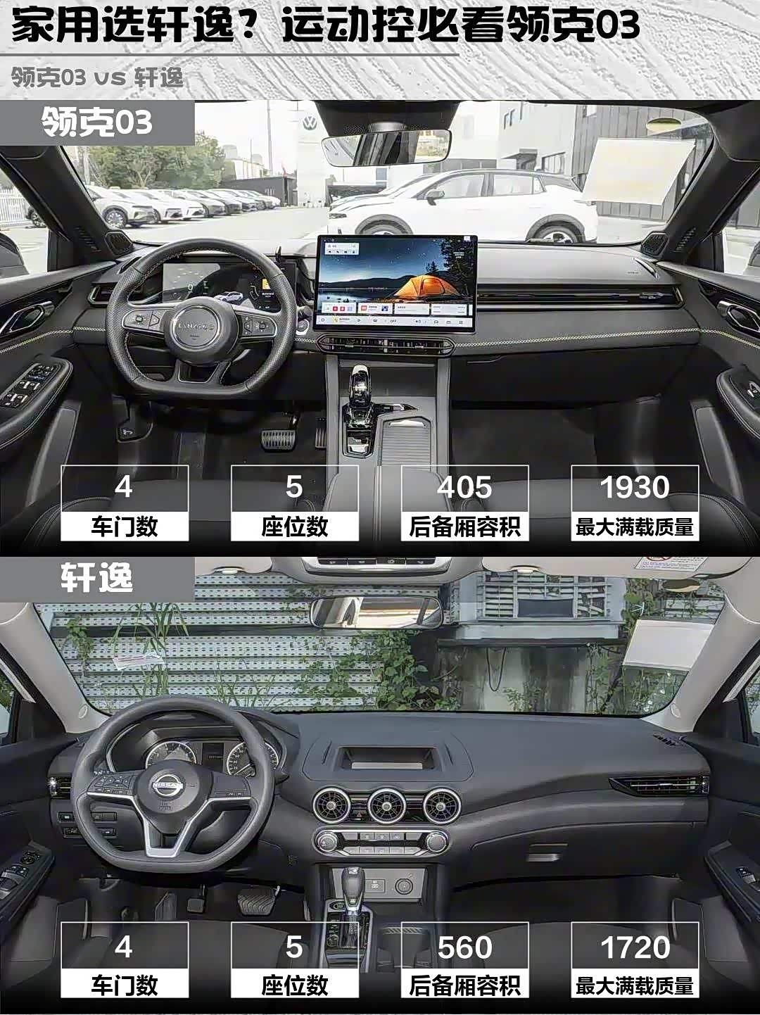 轩逸后排能跷二郎腿,560L后备箱轻松塞婴儿车+露营装备。领克03后排头部稍压抑,405L后备箱装两个登机箱就满,但前排运动座椅包裹性绝了!翻毛皮材质冬天不冰屁股,激烈驾驶时能把人牢牢固定住。