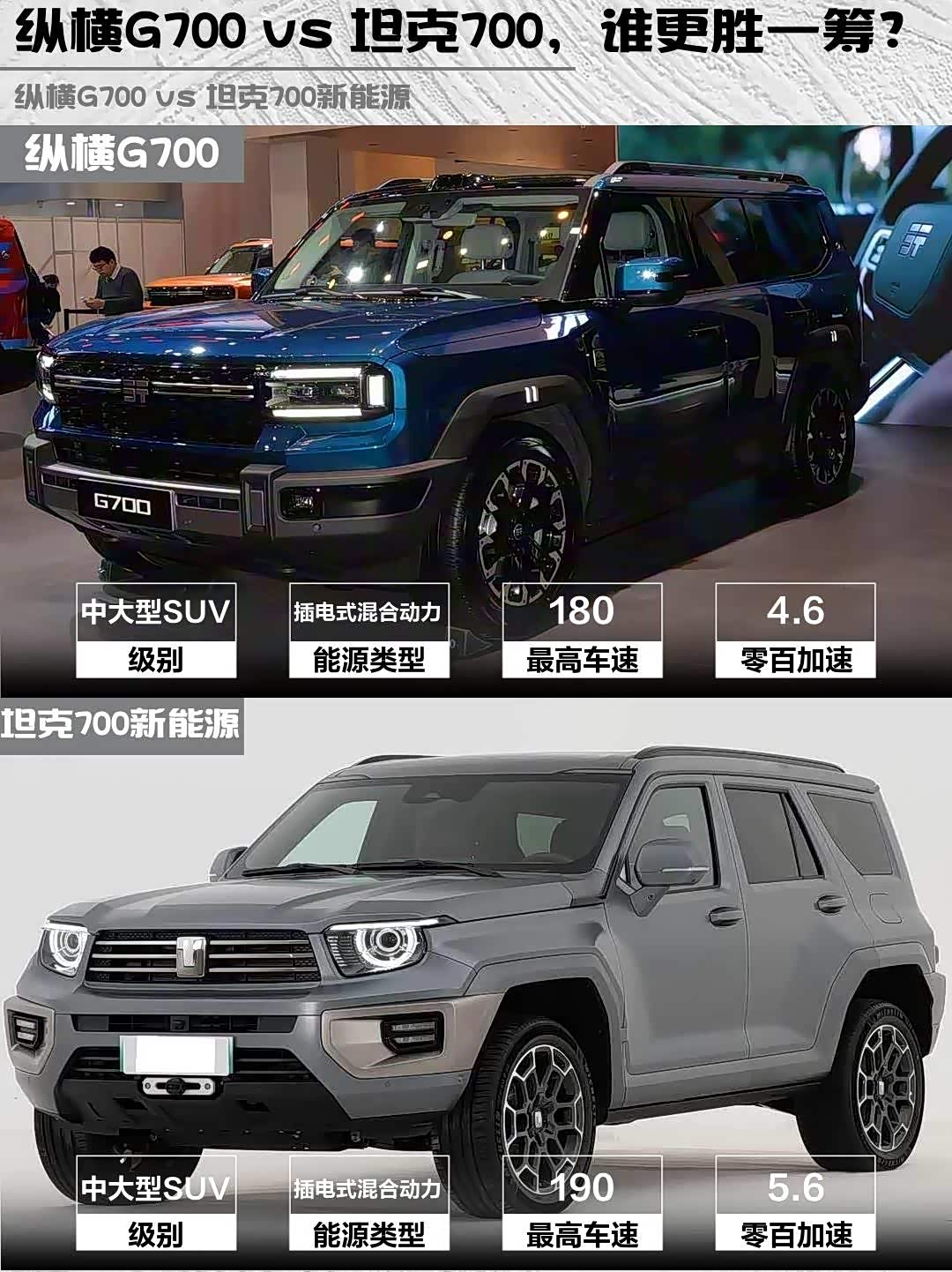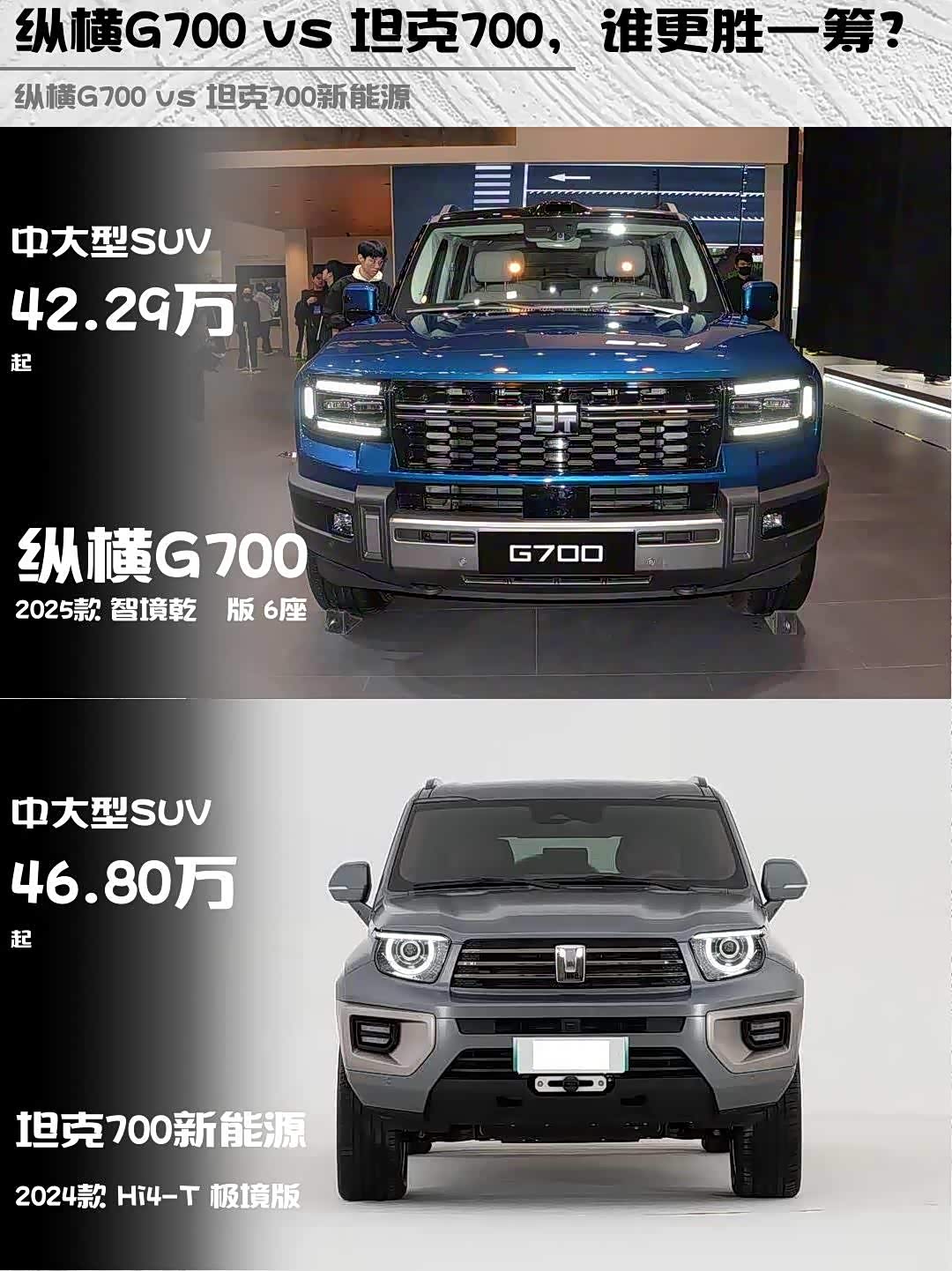 纵横G700智境乾崑版42.29万,坦克700极境版46.8万,差价4万多。G700的终身质保政策和混动经济性是亮点,坦克700的3.0T V6情怀值和改装潜力也不容忽视。