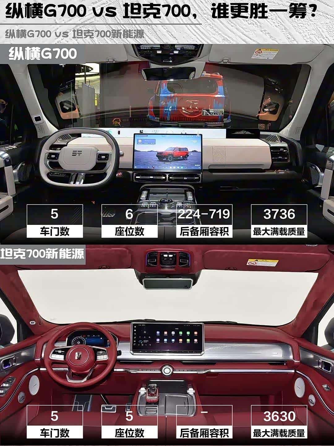 纵横G700车长5198mm,比坦克700长了108mm,六座布局第二排是独立航空座椅,带腿托和加热/通风。三排坐175cm成人没问题,后备箱立起三排还有224L容积。坦克700是五座设计,后排腿部空间够用但不如G700奢侈,不过Nappa真皮座椅的质感更胜一筹。如果是家庭出行,G700的实用性明显更好。👨👩👧👦