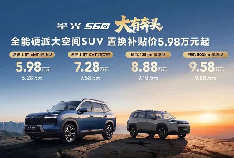 大尺寸,硬派SUV,五菱 星光560(参数|询价)上市,4款车型,售价 6.28-9.88万元,置换补贴价5.98-9.58万元。