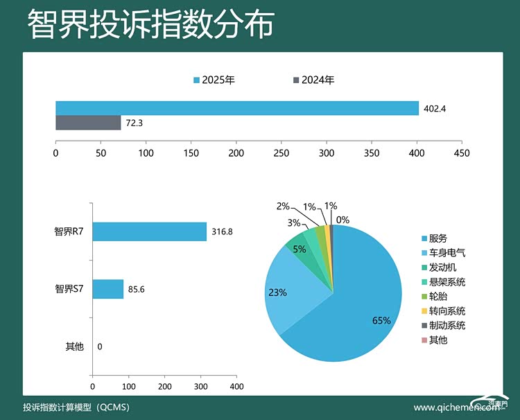 汽车质量投诉点评:过去的一年,智己的投诉指数达到了526.5,同比上涨了101%,经销商不退订金、驾驶辅助故障、悬架吃胎偏磨、空调喷白粉成为上榜理由。从投诉反馈来看,2025款智己L6和智己LS6是经销商不退订金问题的重点投诉车型。驾驶辅助故障具体表现为开启NOA闯红灯、车辆自启动冲出车位、辅助泊车不能识别障碍物等。悬架吃胎偏磨和空调喷白粉也有车主投诉,二者合计投诉占比12%。