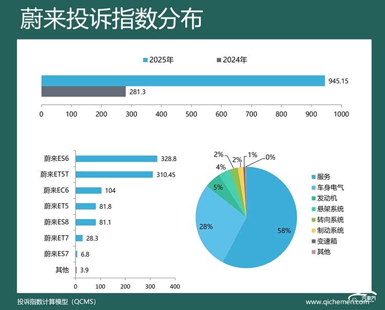汽车质量投诉点评:去年,蔚来投诉指数同比上涨了236%,新车降价、经销商订金不退、驾驶辅助故障遭到车主投诉。其中,新车降价的投诉指数达到了354.9,占比38%,2024款蔚来ES6、ET5T是重点投诉车型。有车主投诉称,4S店销售以“清仓绝版”、“价格洼地”、“抄底好时机”、“新款必涨价”等诱导购车,隐瞒2025款全面升级且价格更低的事实。经销商不退订金和驾驶辅助故障也遭到车主投诉,但整体投诉量并不高,二者合计投诉占比9%。