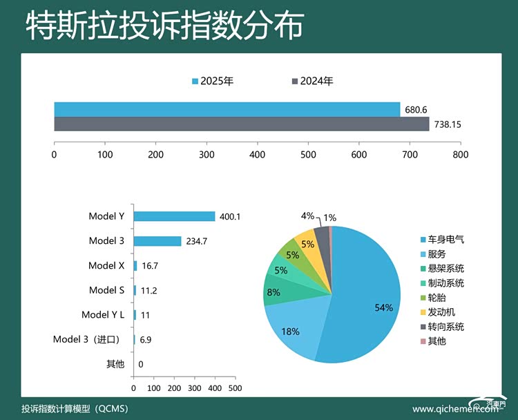 汽车质量投诉点评:去年,特斯拉投诉指数同比下滑了8%。从投诉反馈来看,驾驶辅助故障、座椅故障、部件开裂是其典型投诉问题。其中,驾驶辅助故障具体表现为主动刹车无故介入、自动泊车失灵等;座椅故障则体现在副驾头枕暴晒表层出油、座椅缝纫不良、鼓包起泡等。此外,部件开裂也遭到了车主的投诉,具体部位为天窗玻璃和后风挡开裂。值得一提的是,这三大问题的投诉量并不高,合计投诉占比11%。