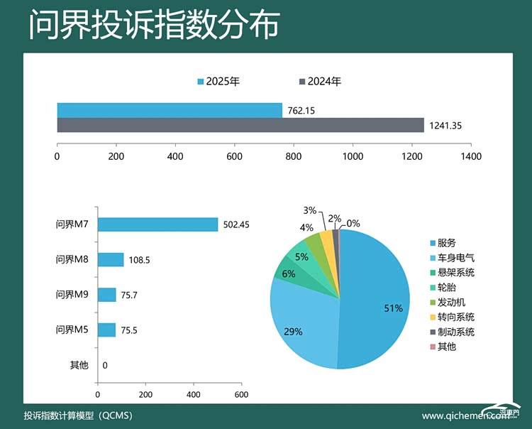 汽车质量投诉点评:2025年,问界投诉指数同比下滑了39%,成为榜单中下滑幅度最大的新势力。从投诉反馈来看,经销商不按约交车、经销商不退订金、驾驶辅助故障成为投诉原因。有车主投诉称,下订2026款问界M7时,交付专员明确承诺4-6周便可提车,但但超出承诺交付周期多周后,车辆仍未交付。交付专员表示受供应链影响,交付时间已经超出经销店掌控范围。另有车主表示,自己因车辆迟迟无法交付不愿再等待,向销售人员表示想要退款意愿时遭到拒绝。与此同时,驾驶辅助故障也遭到了车主投诉,占比9%。