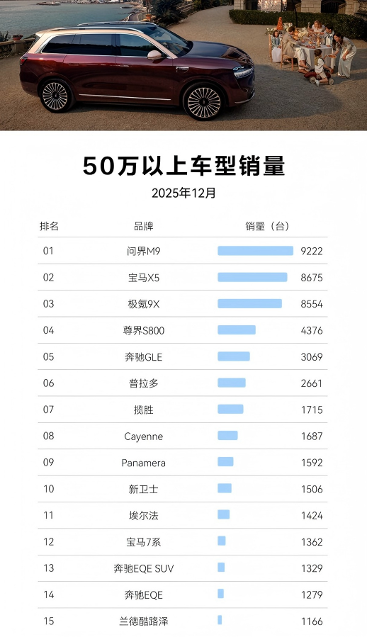 2026年1月中旬,当各大汽车数据平台陆续公布2025年12月的销量数据时,一份以车辆上牌时购买交强险数量统计的上险量数据报告,吸引了众多汽车行业人士和消费者的目光。在这份报告中,问界M9以12月9222辆的上险量,在竞争激烈的50万以上豪华市场脱颖而出。