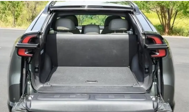 长安启源E07的车尾整体造型方正,环形尾灯与横条灯组相呼应,呈现出流畅而统一的视觉效果。熏黑的后包围与行李架设计不仅实用,还增添了几分豪华感。当然,该车的最大特点在于其多形态设计:在常规状态下,车顶线条持续下降,展现出轿跑SUV的风格;而上半部分可像天窗一样打开,完全打开后则呈现出皮卡的造型。