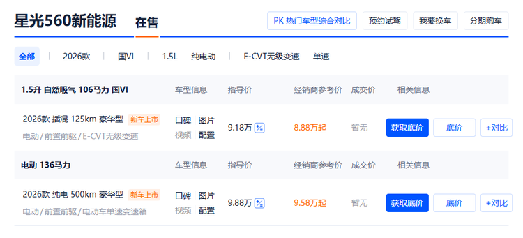 1月15日,五菱 星光560(参数|询价)正式上市,共推出两款配置,均定位紧凑型SUV。两款车型分别为插混125km豪华型与纯电500km豪华型,官方指导价分别为9.18万元和9.88万元;针对置换用户,品牌还推出专项补贴政策,补贴后两款车型的实际入手价格可降至8.88万元、9.58万元。