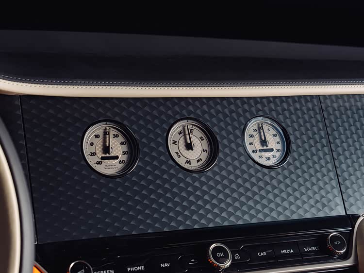宾利标志性的旋转显示系统在Batur Convertible #4上同样进行了定制处理。三组仪表采用定制彩色表盘,与缎面蓝色机械时钟表盘保持一致色调。这种定制并非改变系统功能,而是在显示风格、表盘配色层面进行微调,使其与整车内饰语境保持一致。在实际使用中,这种处理方式更利于长期观感稳定,也避免因过度设计影响驾驶专注度。