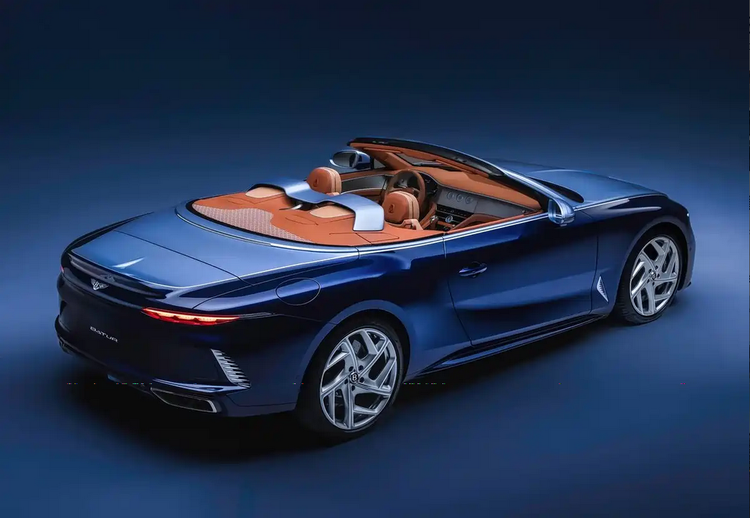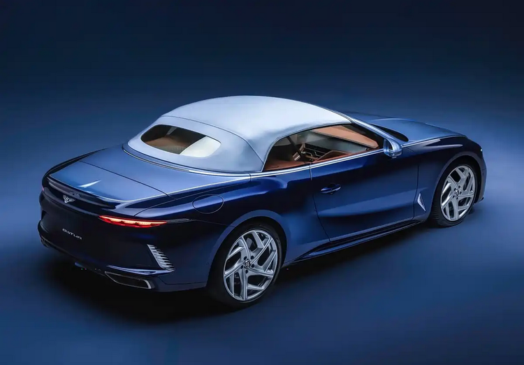 Batur Convertible #4采用软顶敞篷结构,而非硬顶折叠方案。这一选择在结构重量、车身重心与设计自由度之间取得平衡,也更符合高端GT敞篷车的使用逻辑。软顶区域与前机舱盖同样采用高光银配色,通过颜色延伸弱化敞篷结构的分割感。双色车身之间的拼缝由银色环抱式镀铬饰条衔接,形成完整的侧面轮廓。前后侧翼子板维持宽体设定,但并未通过外扩结构强化视觉冲击,而是通过曲面过渡保持车身比例协调。轮圈采用异形Y字形五辐设计,条辐表面加入午夜蓝拉花,与车身主色建立关联,使轮圈成为整体视觉的一部分,而非独立装饰件。