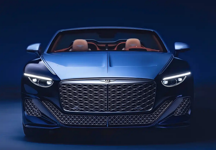 在前脸部分,Batur Convertible #4并未进行结构性改动,完整保留Batur家族设计语言。狭长灯组通过半圆线条完成轮廓收束,内部LED光源并未刻意隐藏,而是以可识别结构呈现。前格栅采用带弧度的矩形轮廓,内部为菱形格纹结构,中网表面使用镀铬处理,与车身高光银区域形成呼应。前包围维持三分式布局,中部U形进气开口与两侧四边形通风区域构成明确功能分区。在实际视觉感受中,这套设计并不强调激进风格,而是以比例控制和材质层次体现GT车型应有的稳态气质。