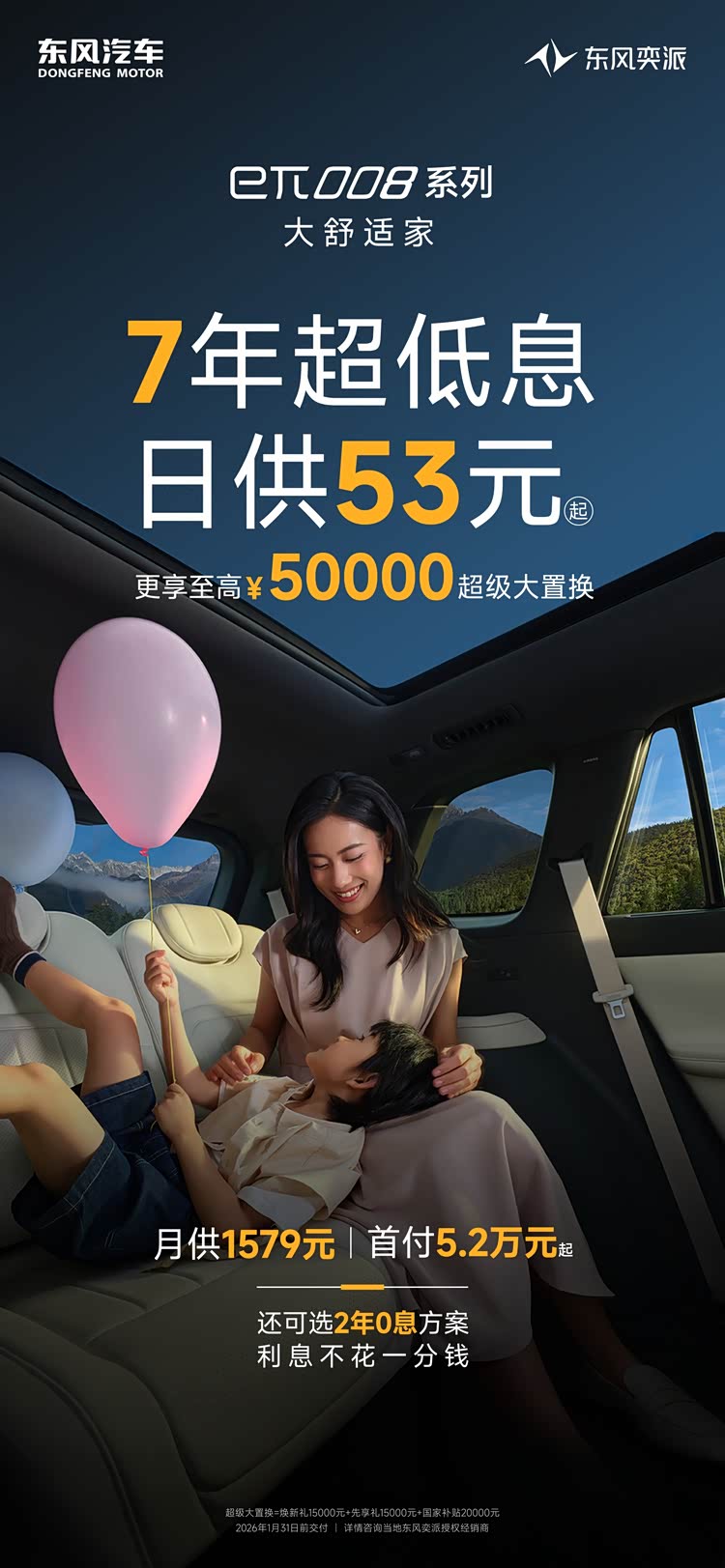 新年刚启,春节购车热潮已提前升温。继特斯拉、小米推出“7年超低息”购车金融政策后,各大品牌纷纷亮出底牌,争夺开年第一波消费热情。在这股浪潮中,东风奕派也积极跟进,在此前“国补焕新 购享无忧”福利基础上再度加码,针对全系主力车型推出“7年超低息”金融方案,旨在进一步拉低入手门槛,让更多消费者能够轻松步入高品质新能源出行生活。