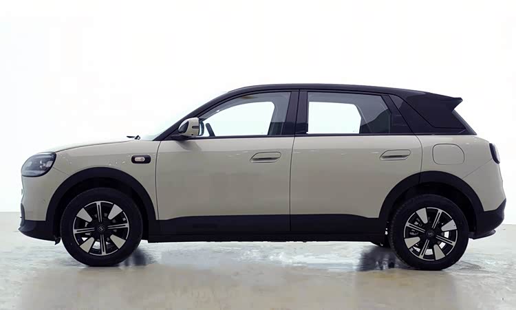 车身侧面造型简洁干练,车顶使用了黑色涂装,双色涂装的后视镜很卡通,车门把手为半隐藏式,下包围使用了黑色涂装。尺寸方面,新车长宽高分别为4195/1811/1569mm,轴距2700mm。