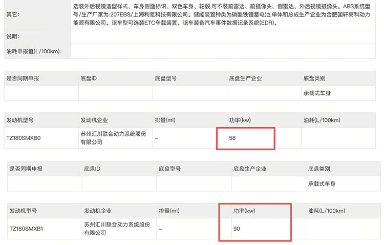 动力部分,根据申报信息显示,新车将会提供两种电机,最大功率分别为58千瓦和90千瓦,匹配的是国轩高科的磷酸铁锂电池组。
