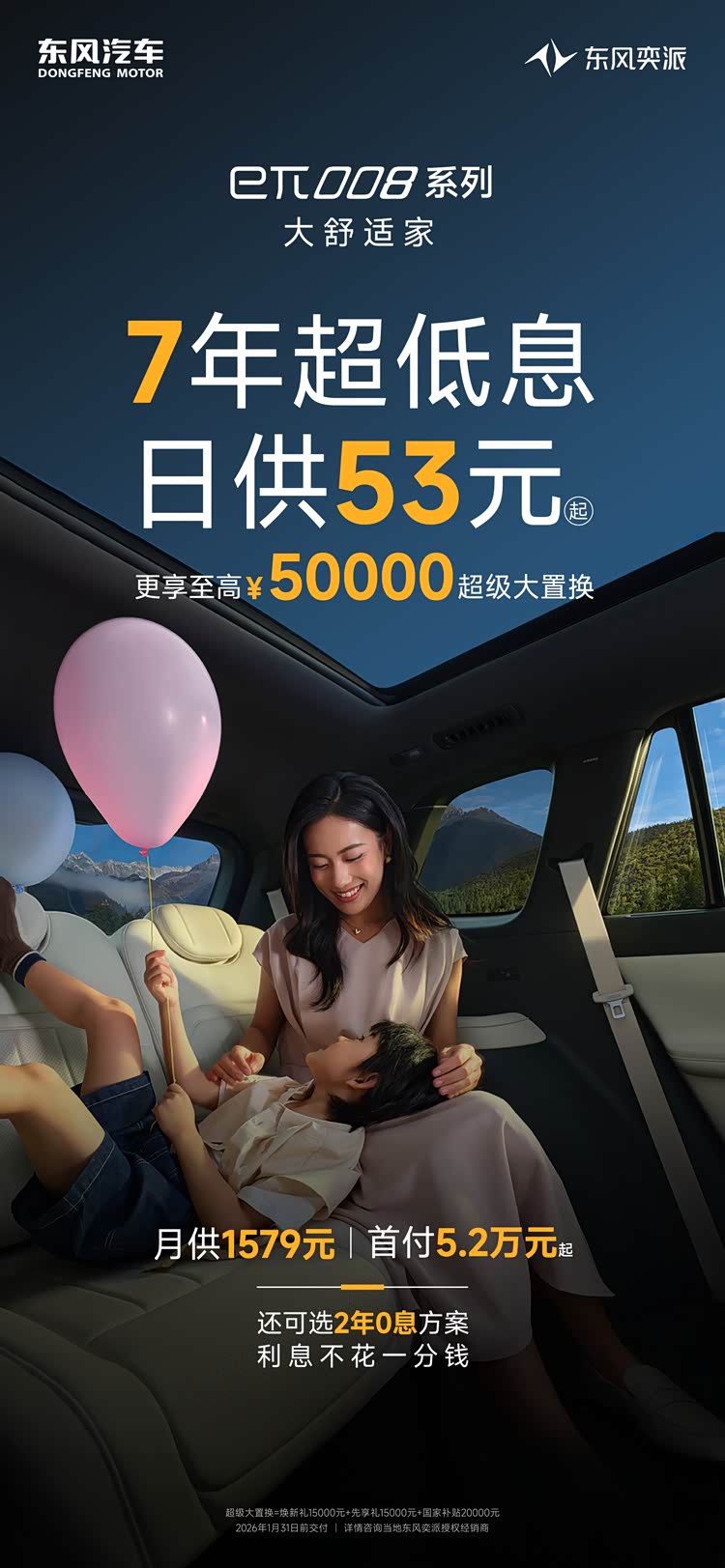 针对家庭出行场景,“大舒适家”eπ008系列以15-20万级中大型SUV销量头部的实力,提供至高50000元超级大置换,首付5.2万元起、月供1579元起、日供53元起或2年0息方案,成为家庭品质出行的最优之选。