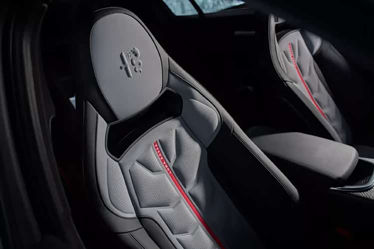 如果说外观的改动是为了性能,那内饰的设计就是一场“航海情怀的狂欢”。座椅选用Sparco竞技桶椅,面料配色直接复刻Luna Rossa船队船员的救生衣,红黑撞色搭配细腻缝线,既保留了赛道座椅的包裹性,又暗藏联名身份的彩蛋。