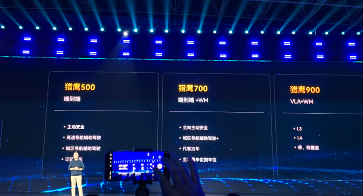 猎鹰 700 则承担着城区辅助驾驶主力方案的角色。在硬件上升级为 11V3R12U1L,引入激光雷达,并结合端到端模型与世界模型(WM),实现更完整的城区导航辅助驾驶能力。该版本已经覆盖车位到车位的导航辅助、代客泊车以及更复杂的城市路况处理,同时在主动安全上实现了全向覆盖。奇瑞在发布会上也明确表示,猎鹰 700 将成为后续城区辅助驾驶普及的重要载体。