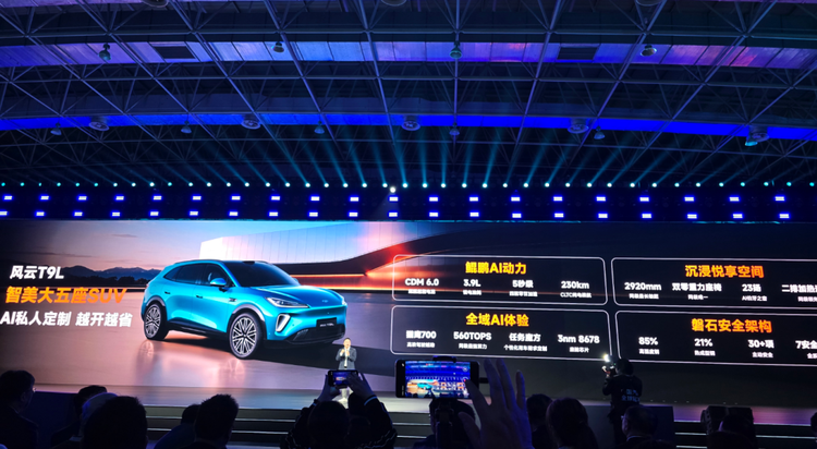 第一款车是风云 T9L。作为本次 AI 之夜最核心的量产车型之一,这款大五座 SUV,也是奇瑞鲲鹏 AI 动力和猎鹰 700 辅助驾驶的重要载体。