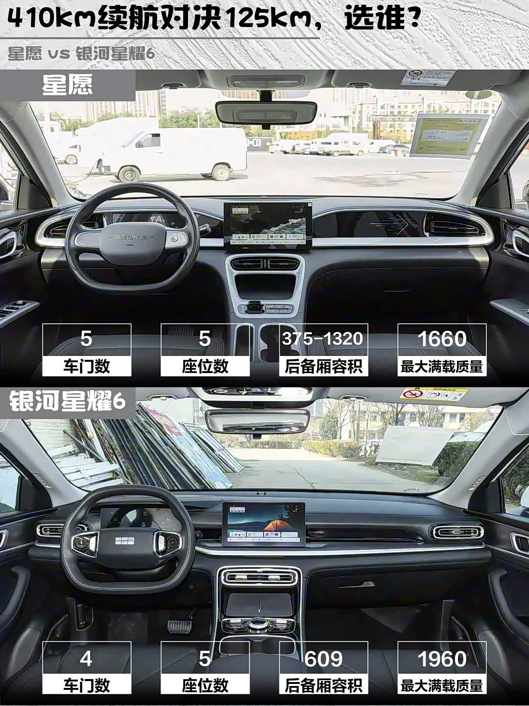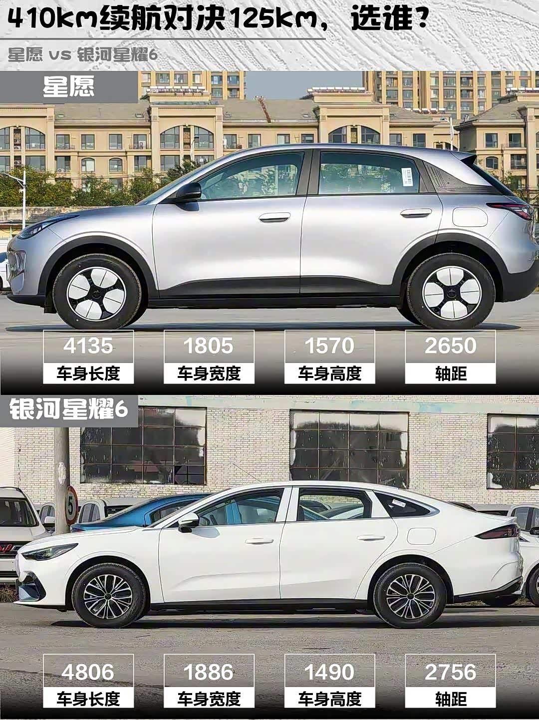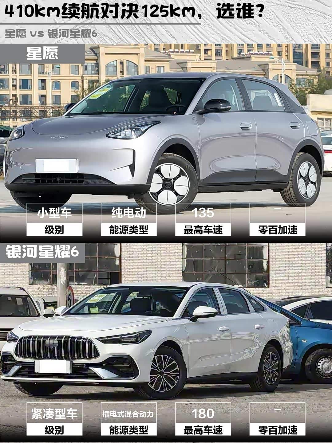 1️⃣ 续航:星愿纯电410km vs 星耀6混动125km+燃油