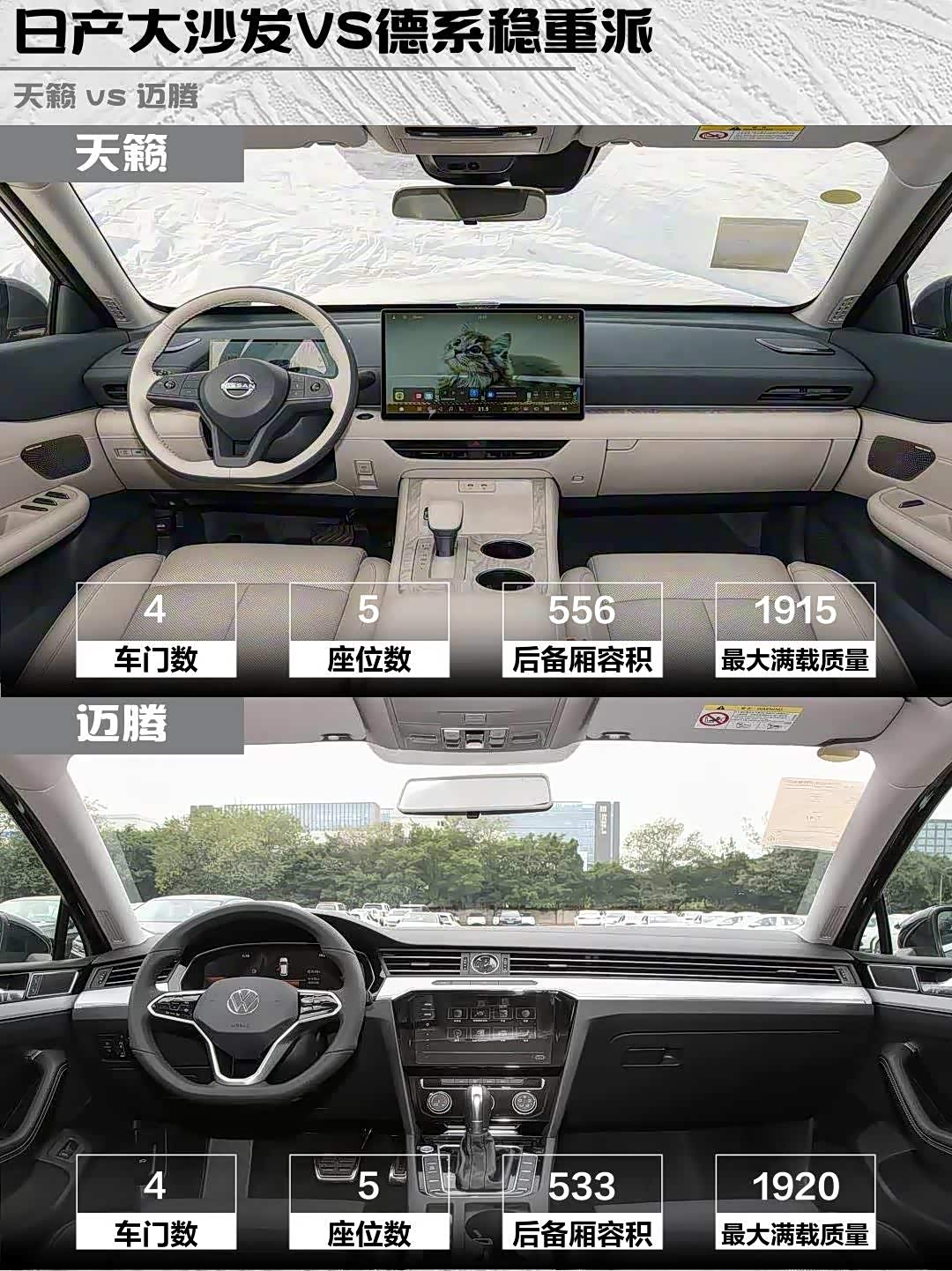 天籁后备箱556L比迈腾533L能装,但缺少实体按键;迈腾前雷达+倒影对新手友好。天籁白色内饰要勤打理,迈腾烤漆面板指纹收集器。两车都有全景天窗,但天窗面积天籁大15%左右。