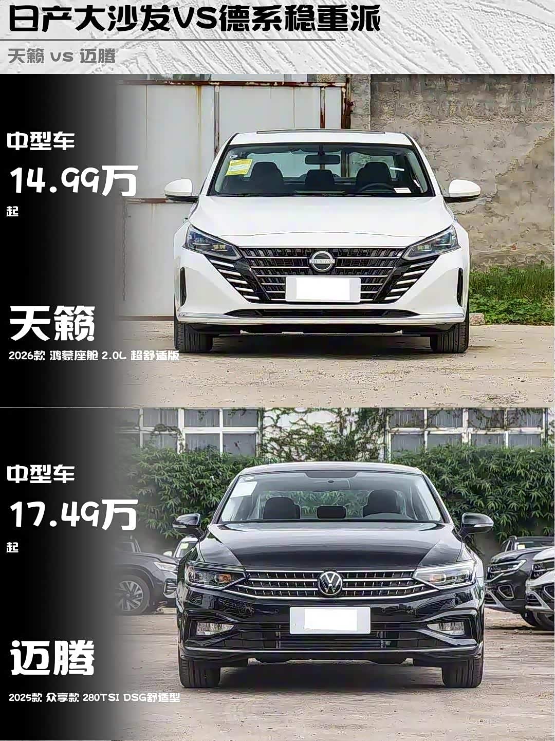 最近在选车的小伙伴看过来!今天深度对比两款热门中型车—— 日产天籁(参数|询价)2026款鸿蒙座舱2.0L超舒适版 vs 大众迈腾2025款众享款280TSI DSG舒适型,实测干货直接上菜!🍜