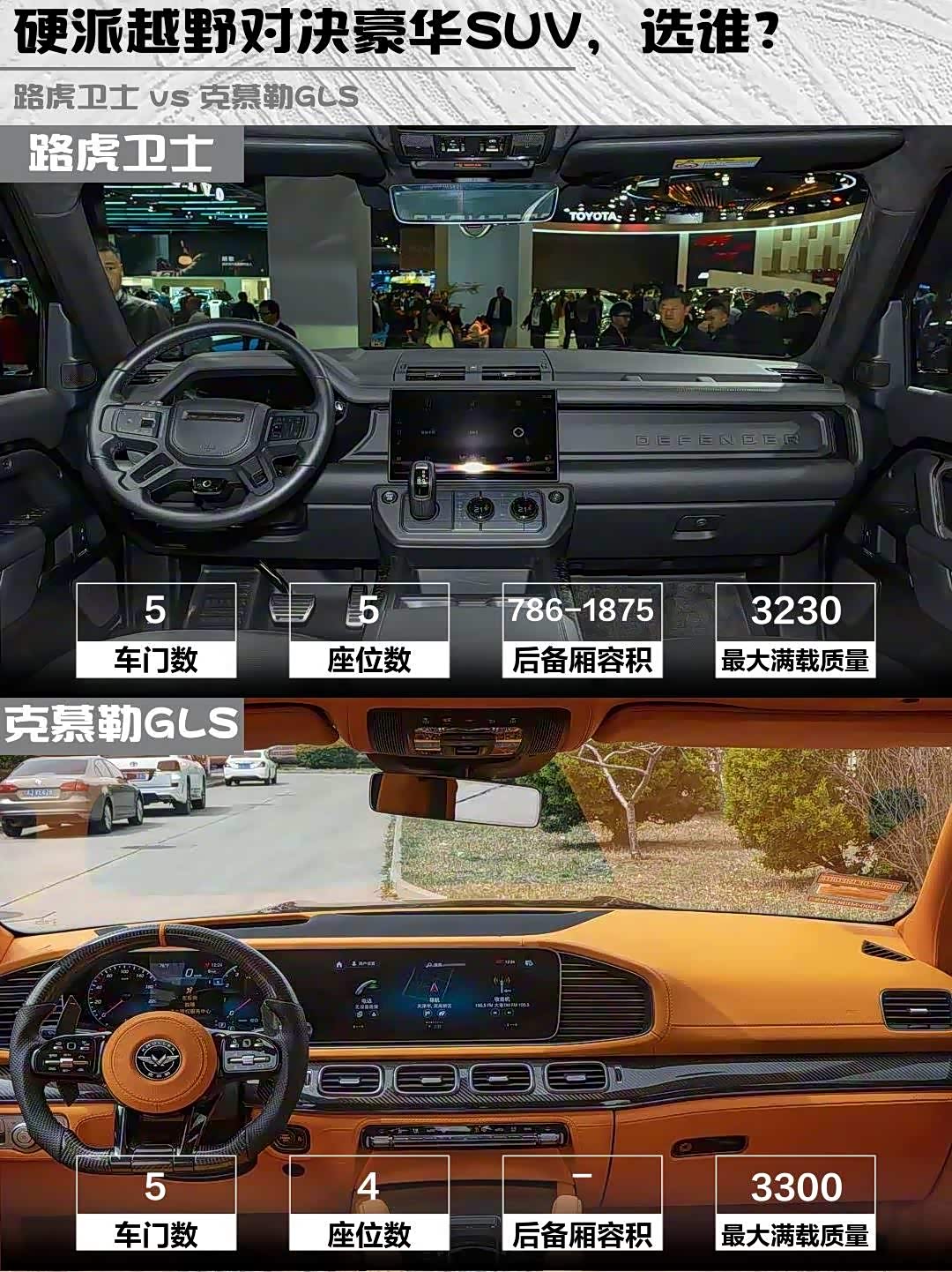 卫士的方盒子造型不是白给的,后备箱786L起,放倒后排直接变身1.8米露营床。最绝的是侧开尾门,取大件行李不用练瑜伽。克慕勒走的是豪华包厢路线,四座布局带电动腿托,真皮座椅带按摩,但装货能力就...上次帮朋友搬家只能塞下两个登机箱。