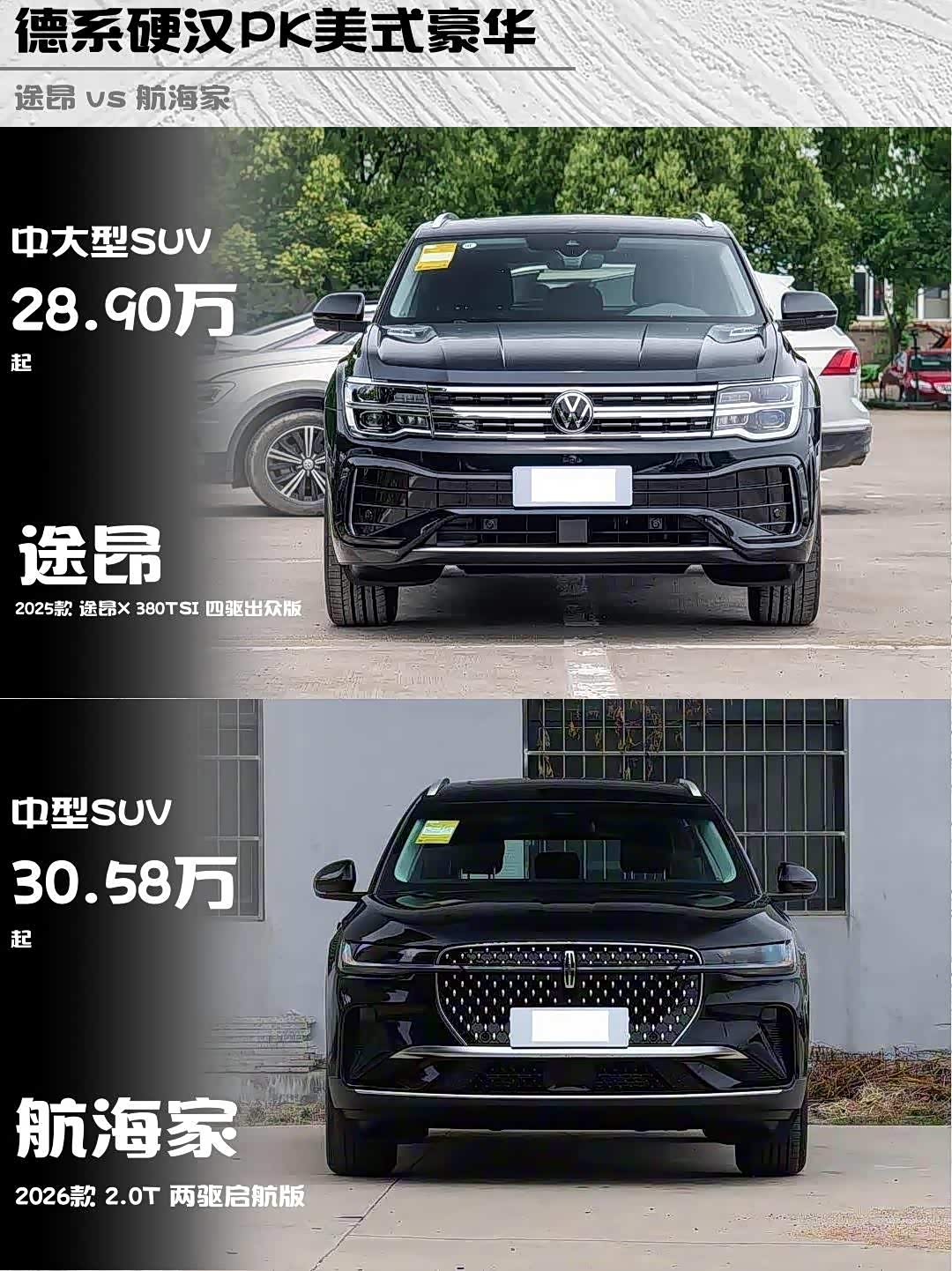 车家号·0浏览·2026-01-19 08:33 · 北京最近在选车的小伙伴看过来!今天给大家深度对比两款热门SUV——2025款途昂X 380TSI四驱出众版和2026款航海家2.0T两驱启航版,看完这篇你就知道哪款更适合你!🔥